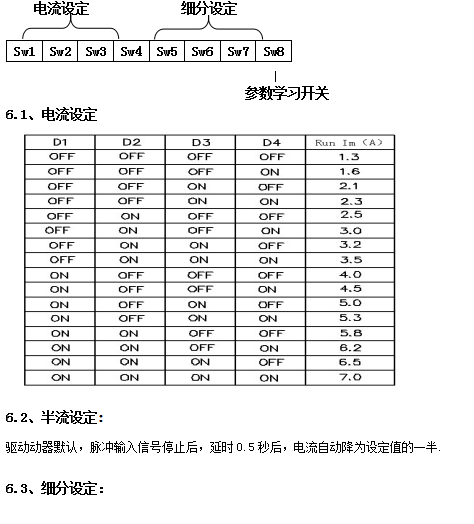 驅動器采用八位撥碼開關設定細分精度、動態(tài)電流、靜止半流以及實現(xiàn)電機參數(shù)學習與PID整定。八位撥碼開關詳細描述如下: