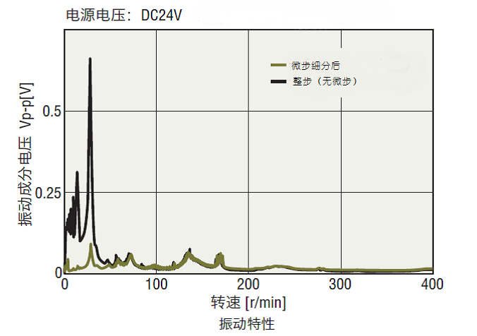 利用微步驅動技術執行步距角的電氣細分化,電動機運轉更加平穩,使低速領域的階段性運轉更加順暢,并如下圖所示地大幅改善振動。