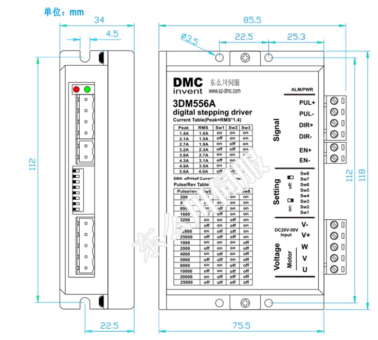 3DM556A型驅(qū)動器,具有更低的電機(jī)發(fā)熱、運(yùn)行噪聲和更高的平穩(wěn)性,以及更低的成本,主要驅(qū)動57型三相混合式步進(jìn)電機(jī)。其微步細(xì)分?jǐn)?shù)有15種,最大步數(shù)為25000Pulse/rev;其工作峰值電流范圍為1.4A-5.6A,輸出電流共有8檔,電流的分辨率約為0.7A;具有自動半流,過壓和過流保護(hù)等功能。本驅(qū)動器為直流供電,建議工作電壓范圍為24VDC-36VDC,電壓不超過50VDC,不低于20VDC。