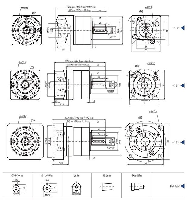 ●配電機尺寸:電機不同,與之匹配的尺寸將有所變化,適配器將不同。本公司減速機能與任何電機匹配安裝。